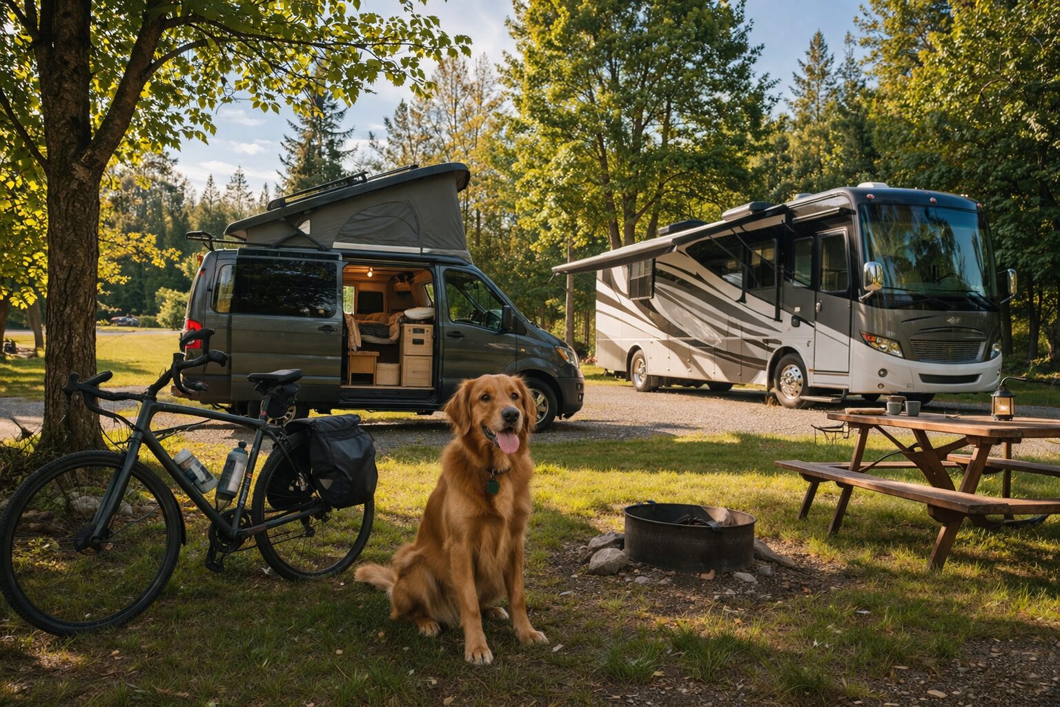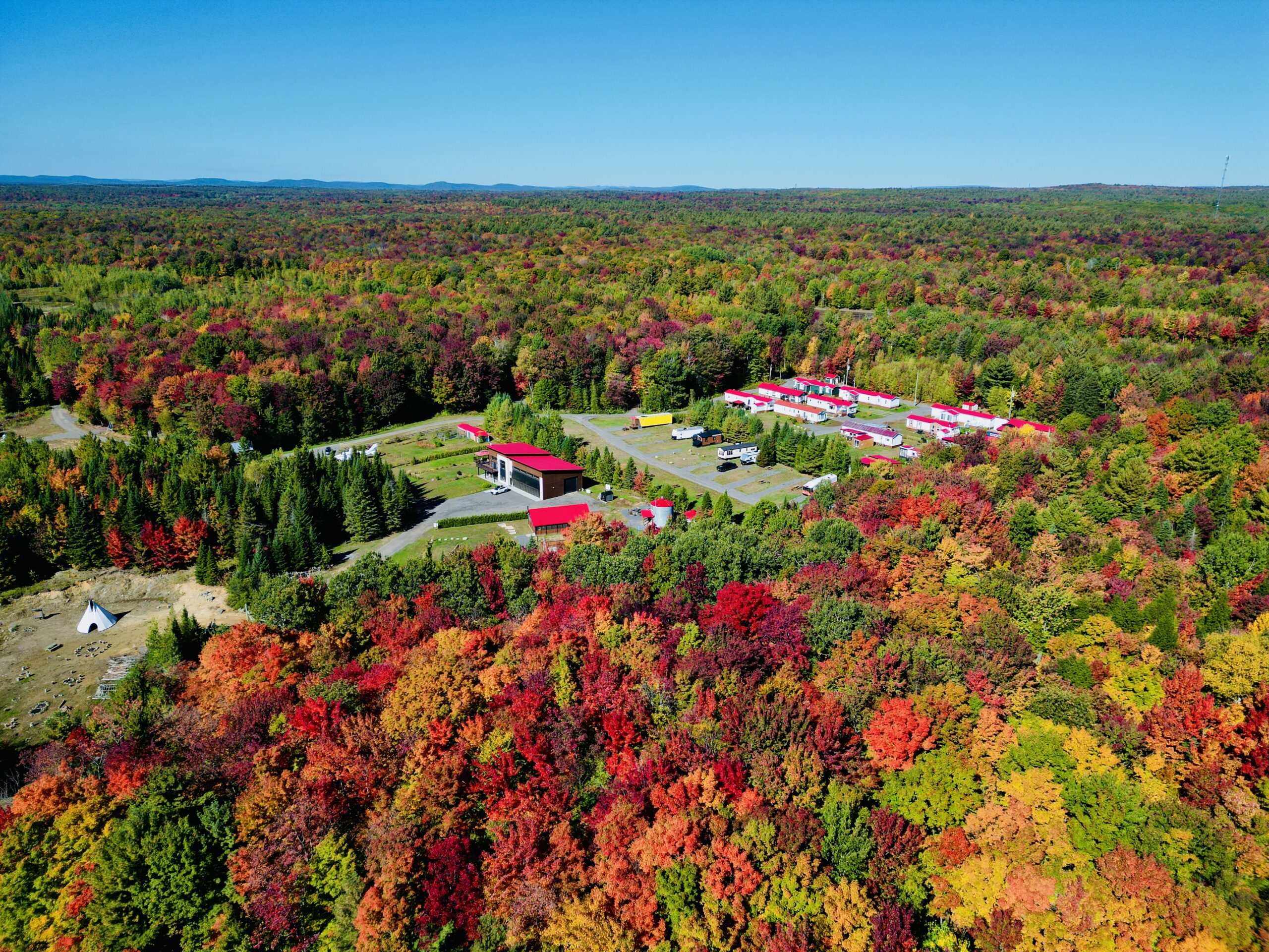Camping 4-saisons pour saisonniers, vanlife et cyclistes. Chiens bienvenus. Emplacements en prairie ou en forêt, de 0 à 4 services, pour tous types d’unités, dans un environnement calme et dynamique accessible en avion, quad et motoneige.